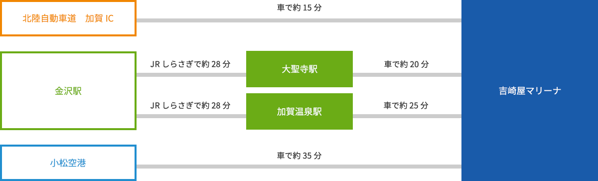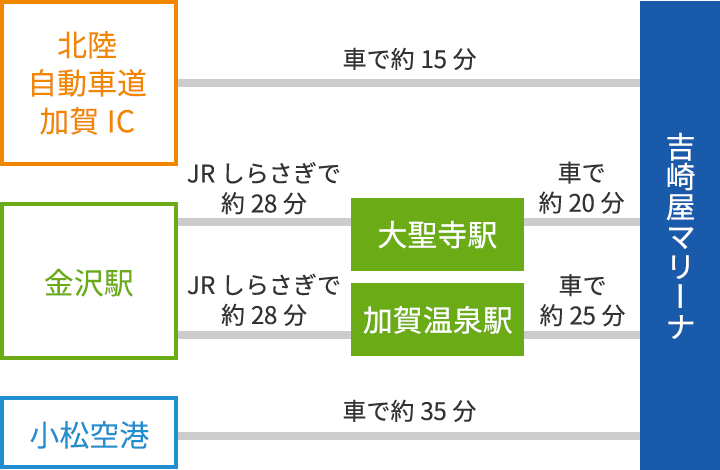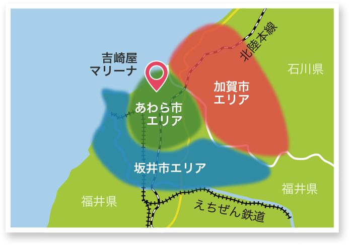北陸自動車道 加賀ICから車で15分。吉崎屋マリーナは40年程前から福井県北潟湖の穏やかな湖畔で、ボートの販売、保管、整備、艤装、レンタルなどのボート関連事業を取り扱います。主にマリーナ業界の長年に渡る経験と技術を活かし、お客様のボートライフを全面的にサポートして参りました。これからも信頼され、安心と感動を与えられるマリーナを目指します。当マリーナでは、特に朝昼晩と表情を変える日本海北潟湖の雄大な景色や四季を通して様々な魚種が釣れる近海でのフィッシングボートが楽しめます。また穏やかな自然に囲まれたマリーナはボートの保管にも最適で、多くのボートフィッシングマニアたちから情報交換の場として親しまれ続けています。ボートライフを始めるなら、ぜひ吉崎屋マリーナをご利用ください。ここでしか味わえない素晴らしい感動を見つけてください。