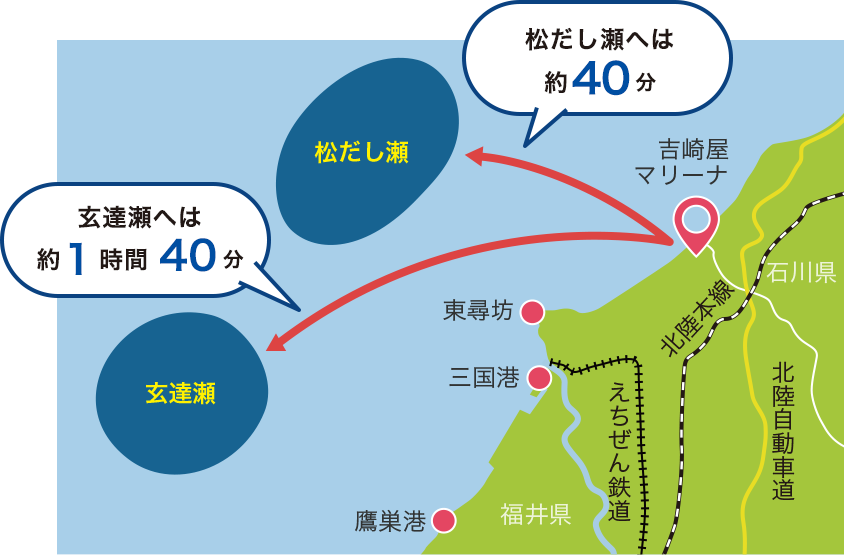 30フィート前後のボートであれば、釣り師の夢である、玄達瀬、松だし瀬への釣行もマイボートで可能です。玄達瀬は福井県沖合にある海の中の山で大型の魚を狙う釣り師にはたまらない漁場です。松だし瀬は、アラ、ノドグロ、ハチメなどの美味しい高級魚を狙える広大な海域の釣果ポイントです。